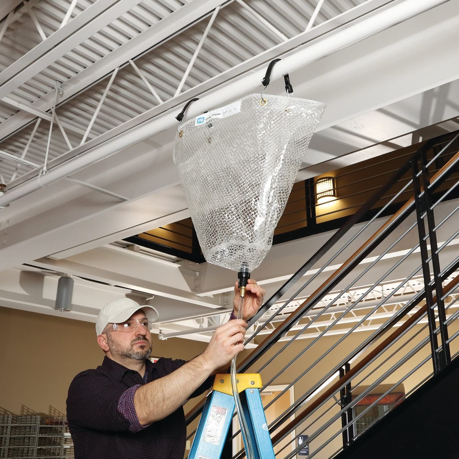 - Hangs from a leaking pipe to catch leaks and channel them to a drain or collection container
